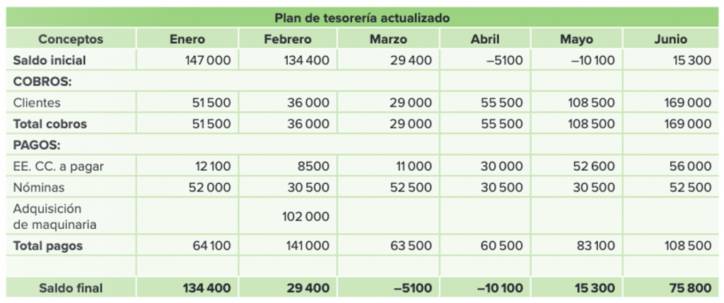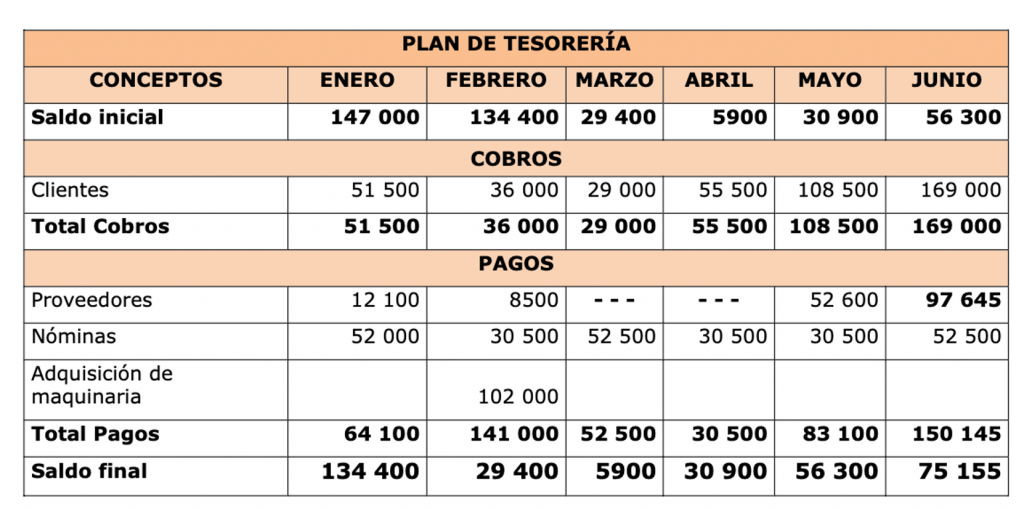 - Enero y Febrero: La empresa genera grandes excedentes de tesorería, cerrando enero con un saldo final de 134.400 €.